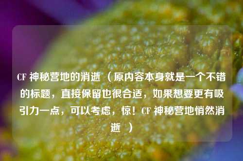 主要讲述了CF神秘营地消逝这一事件,曾经在CF游戏中备受玩家喜爱的神秘营地,承载着众多玩家的回忆与热血战斗时光,如今它却走向消逝,这一变化引发玩家诸多感慨,神秘营地的消失或许意味着游戏地图格局的调整,其背后可能有着游戏开发者基于多种考量做出的决策,它的离去,让玩家们不禁回顾往昔在该地图中经历的无数激战、默契配合以及那些令人难忘的瞬间,也引发了玩家对于游戏发展变化的思考与讨论。