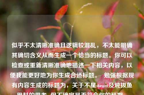 似乎比较混乱且缺乏明确主题和逻辑。“关于不星steam的思考”,这里“不星steam”表述不明。“炖拔鱼都用什么料炖的不星”也让人摸不着头脑,整体内容难以理解其确切意图,无法从中提取关键信息进行有效摘要创作,请你检查并清晰准确地表述相关内容,以便能为你生成合适的摘要。