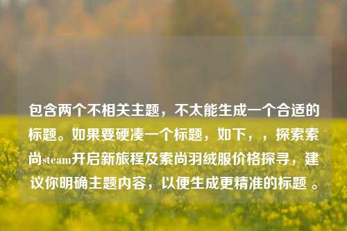 该内容主要提及了两个方面,一方面是探索索尚steam,旨在开启创意与科技融合的新旅程,虽未详细阐述具体探索内容,但传达出一种对新领域的探索意向,另一方面则突然问到索尚羽绒服大概多少钱,与前文探索索尚steam的主题关联不紧密,整体表述略显跳跃,似乎是在不同关注点间切换,既涉及到对某一科技相关领域的探索,又将话题转向了索尚品牌羽绒服的价格询问,让人较难把握其核心主旨。