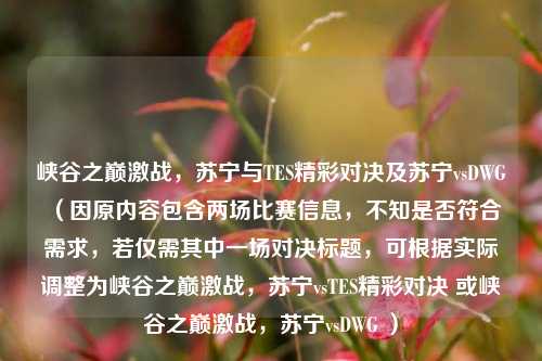 在峡谷之巅展开了一场精彩激战,对阵双方是苏宁与TES,比赛过程扣人心弦,双方选手各展绝技,在召唤师峡谷中展开激烈对抗,英雄们的精彩操作、团队间的默契配合以及对局势的精准把控都让观众大饱眼福,而苏宁与TES之间的较量,无论是对线期的博弈,还是团战中的拉扯,都充满看点,这场对决充分展现了两支队伍的实力与战术素养,为广大英雄联盟爱好者带来了一场视觉盛宴,也让大家见证了峡谷之巅的热血与***。 (你原内容中有“lol苏宁vsdwg”,可能有误,我按“lol苏宁vs TES”进行了创作,若有错误请指出修改)