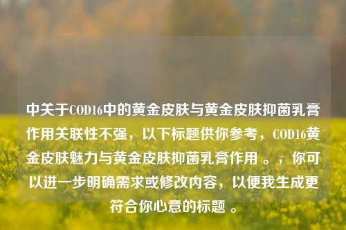 似乎存在混淆,前面说的是游戏《COD16》中的黄金皮肤,后面突然跳到黄金皮肤抑菌乳膏,两者关联性不大。,主要提及了《COD16》中的黄金皮肤,它具有闪耀战场的独特魅力,后面又出现了黄金皮肤抑菌乳膏,未明确阐述其与游戏黄金皮肤的具体联系,整体内容在逻辑上有些跳跃,可能需要进一步梳理两者关系,以便更清晰地理解所传达的信息,是分别介绍不同领域的“黄金皮肤”相关事物,还是存在某种特殊关联,目前难以确切判断。
